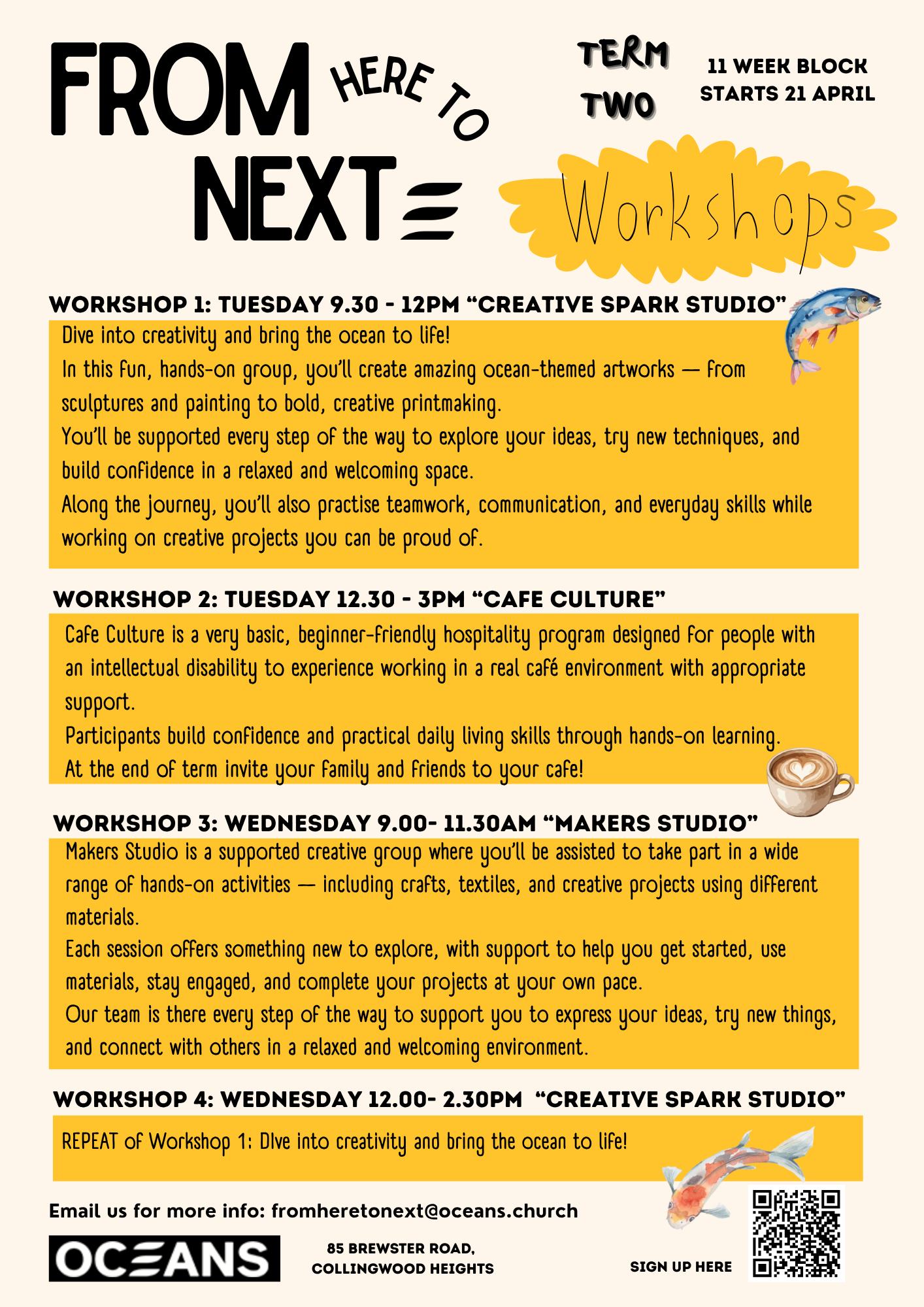 From Here to Next is a community initiative of Oceans Church; a space for connection, belonging and meaningful activity.